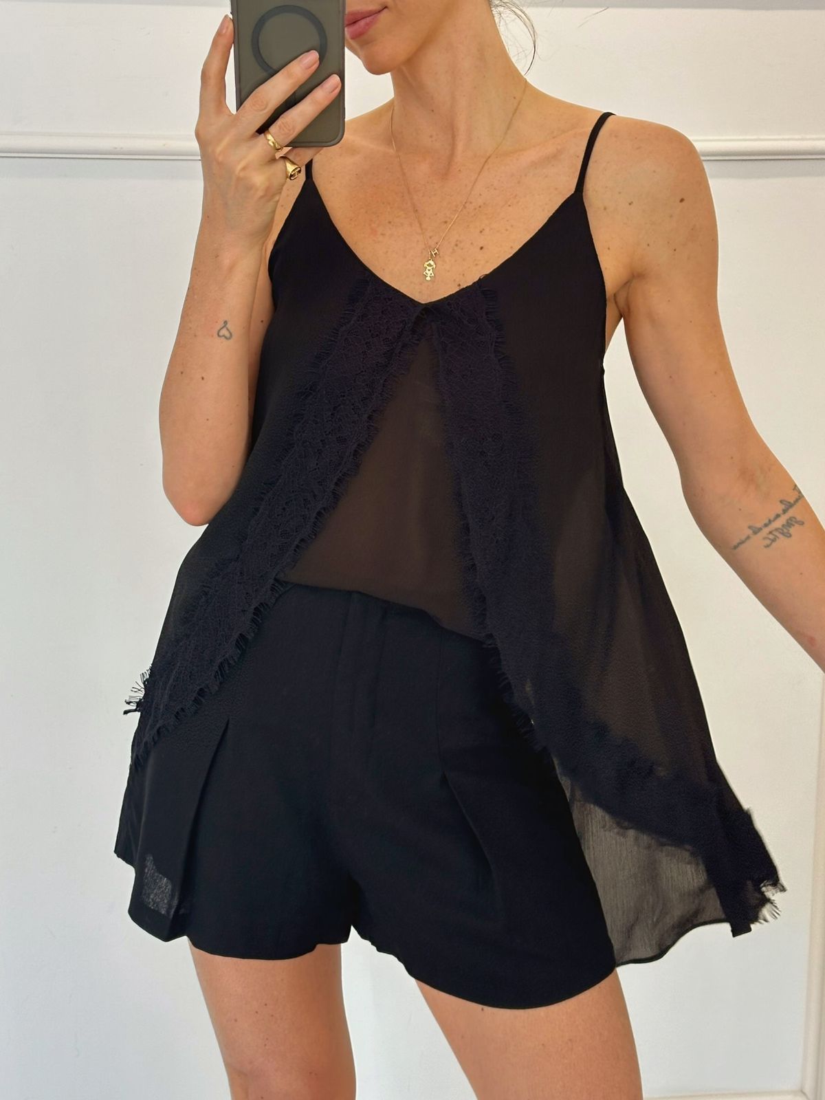 Decote em V com alças finas, garantindo um toque feminino e elegante